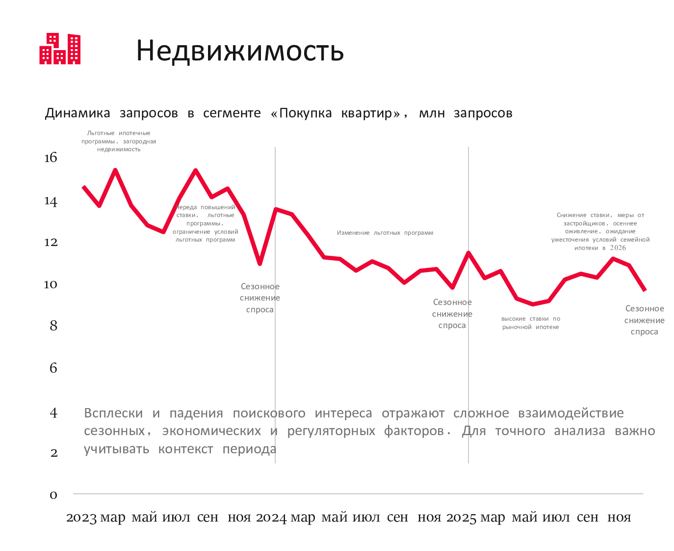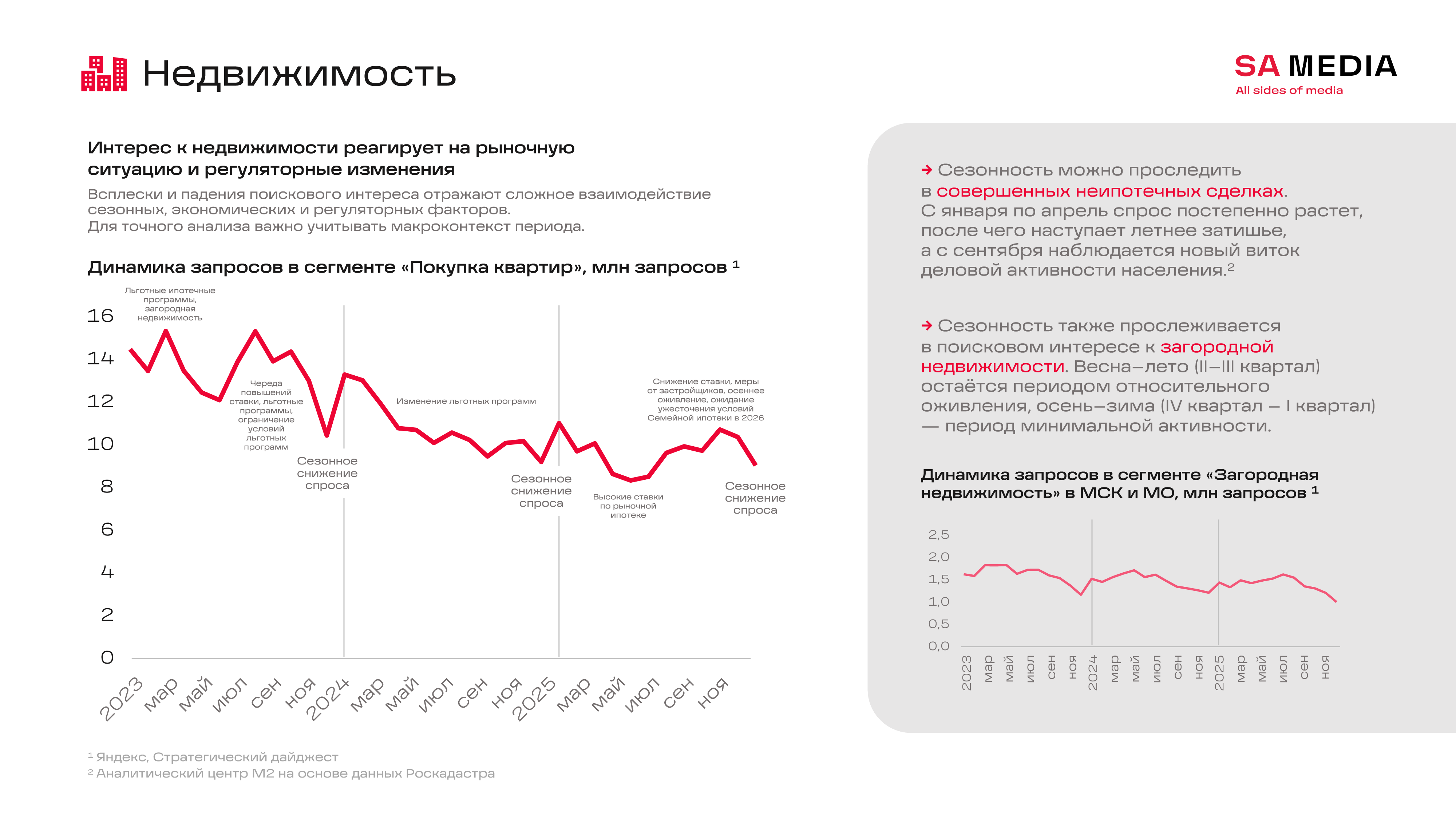 Рынок недвижимости имеет выраженную сезонность, но она часто нивелируется или смещается макроэкономическими и регуляторными факторами. Ключевое отличие: спрос здесь управляется не только календарем, но и решениями государства, ставкой ЦБ и доступностью ипотеки.
