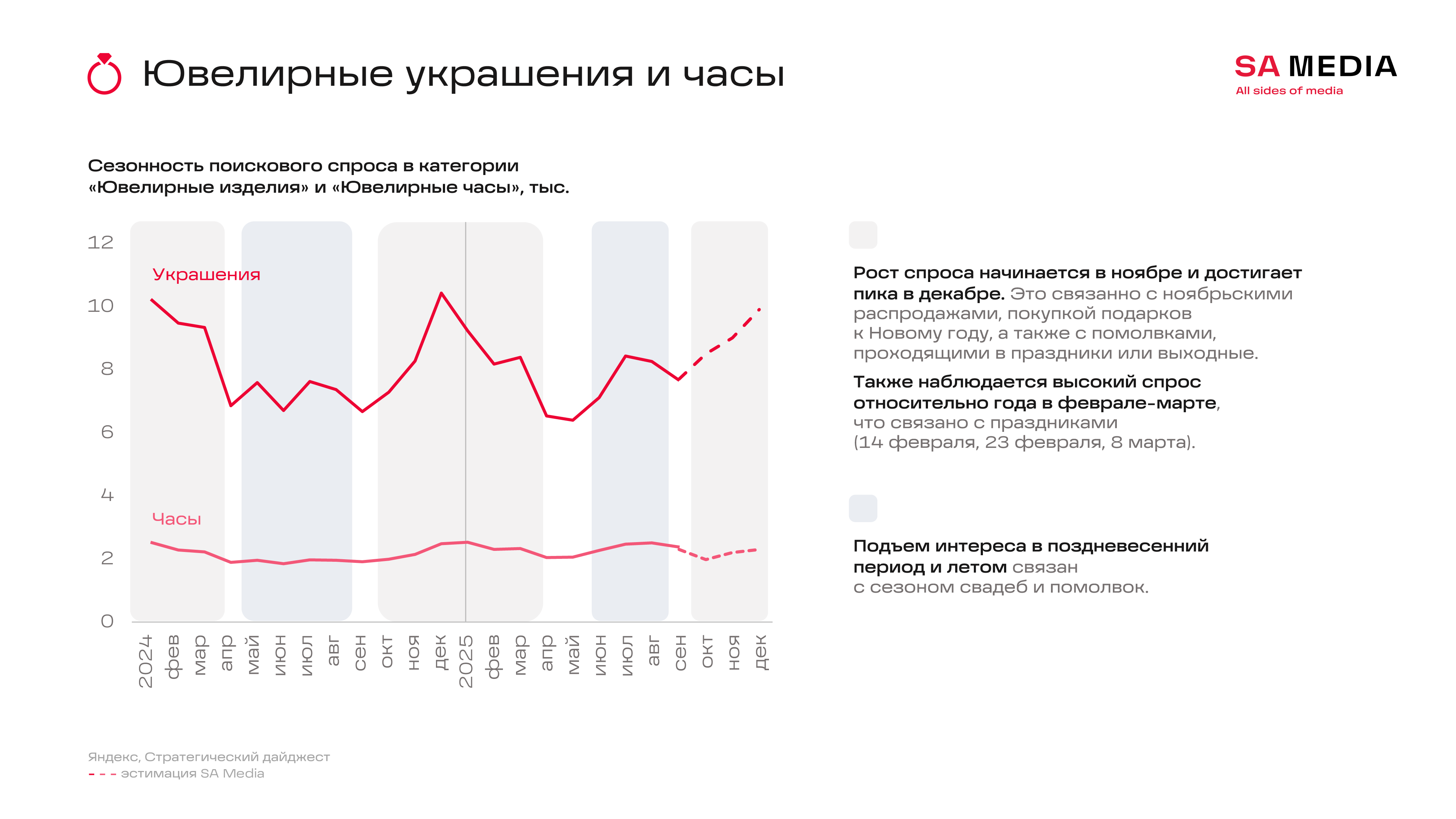 Спрос на часы распределен равномерно в течение года. Это категория с более длинным циклом принятия решения, часто связанная с самоутверждением, инвестиционной ценностью или статусом.