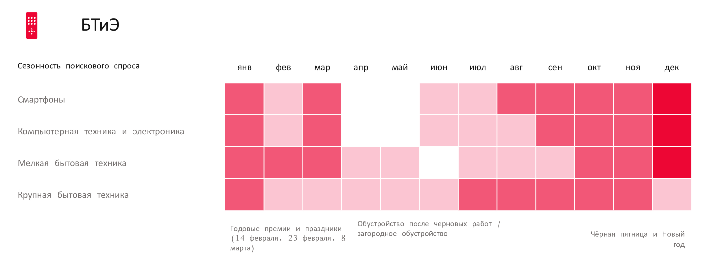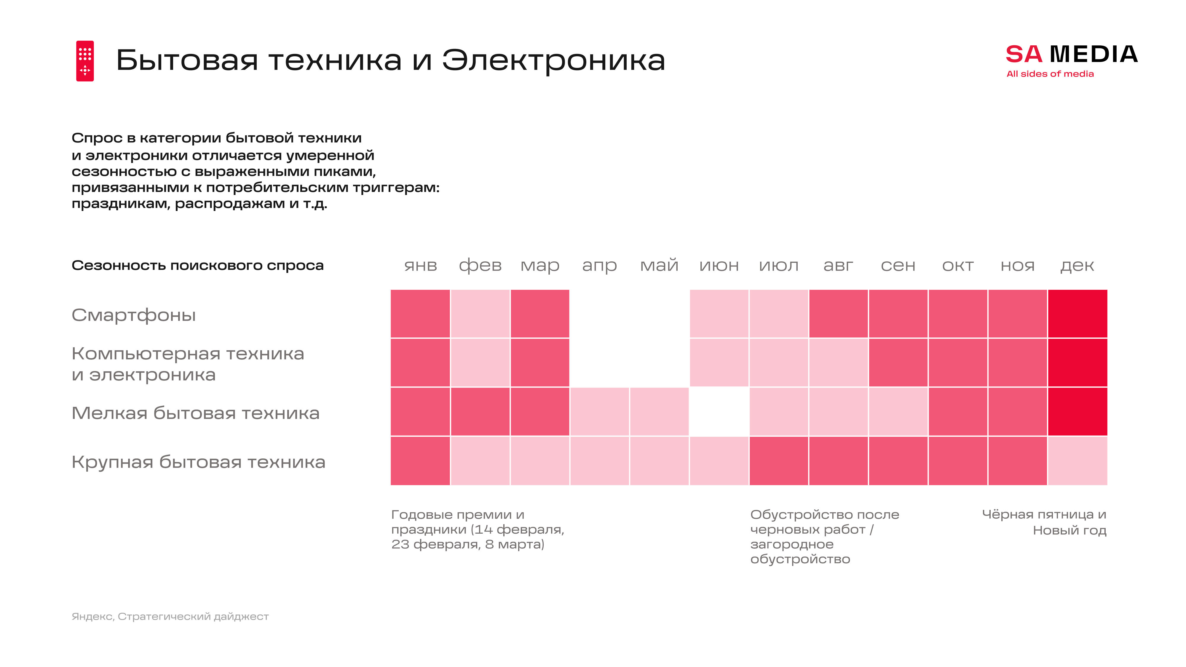 В сегменте бытовой техники и электроники сезонность проявляется не так ярко, как в фешен или туризме, но она устойчива и предсказуема. Ключевая особенность — три разноприродных пика, каждый из которых требует отдельной стратегии.