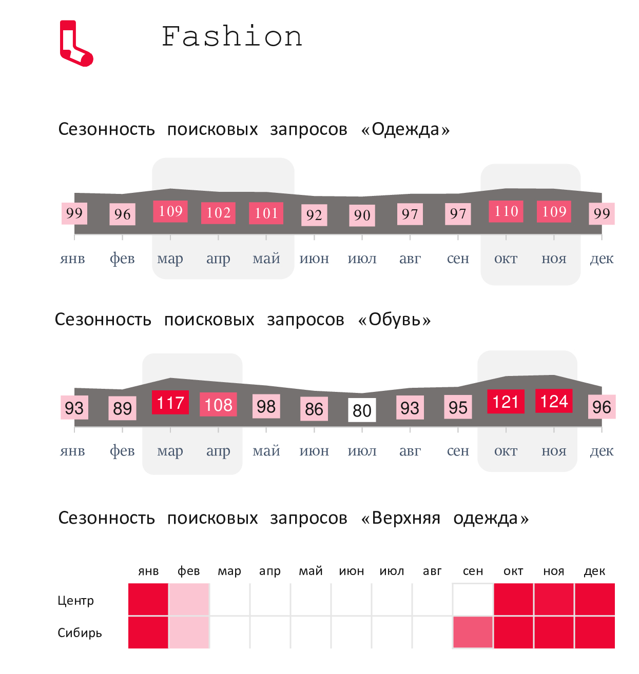 — Январь–март — обновление гардероба, подарки к 14 февраля, 23 февраля, 8 марта. Рекламные кампании стоит запускать с середины декабря, делая акцент на подарочные наборы.