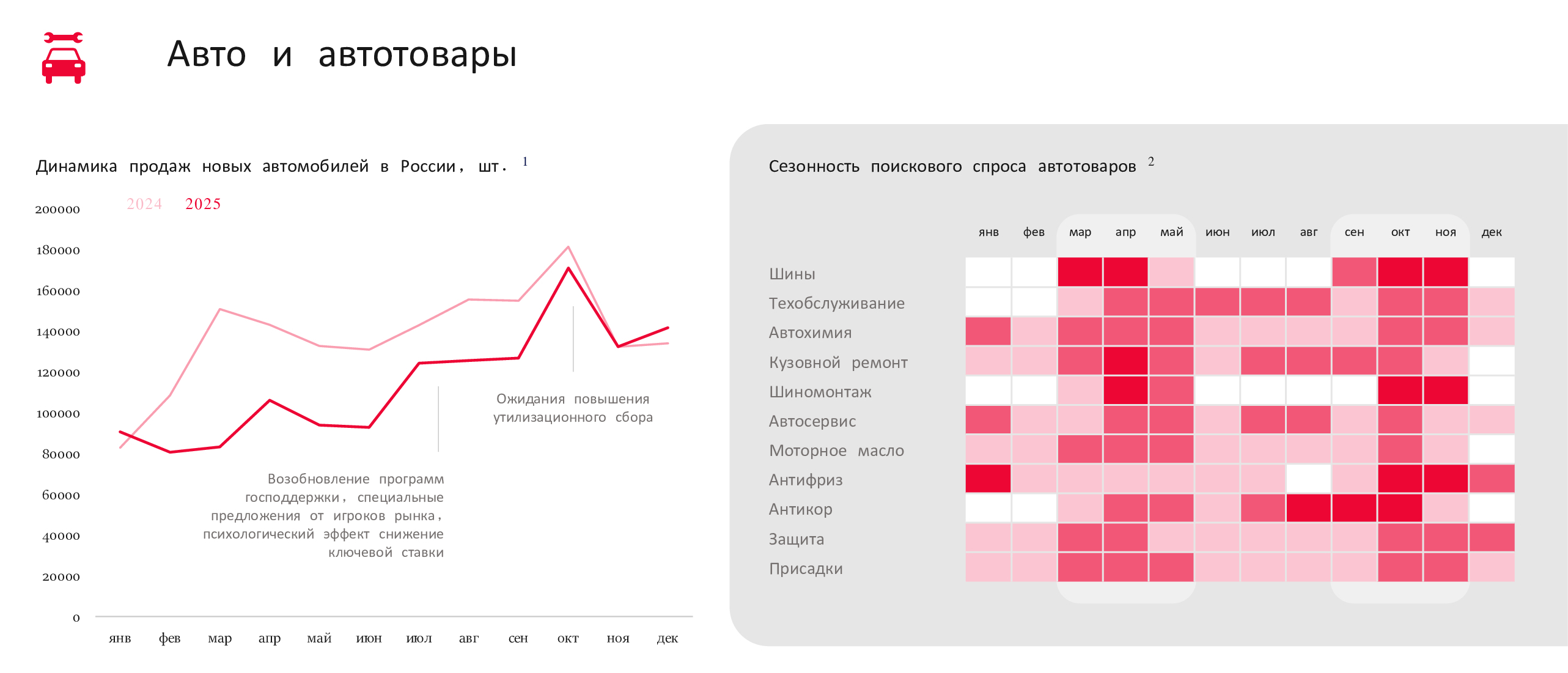 - Пик поиска ≠ пик продаж. Пользователь начинает изучать вопрос за 4–8 недель до покупки. Реклама, запущенная в пик спроса, часто опаздывает — она попадает в момент, когда выбор уже сделан.