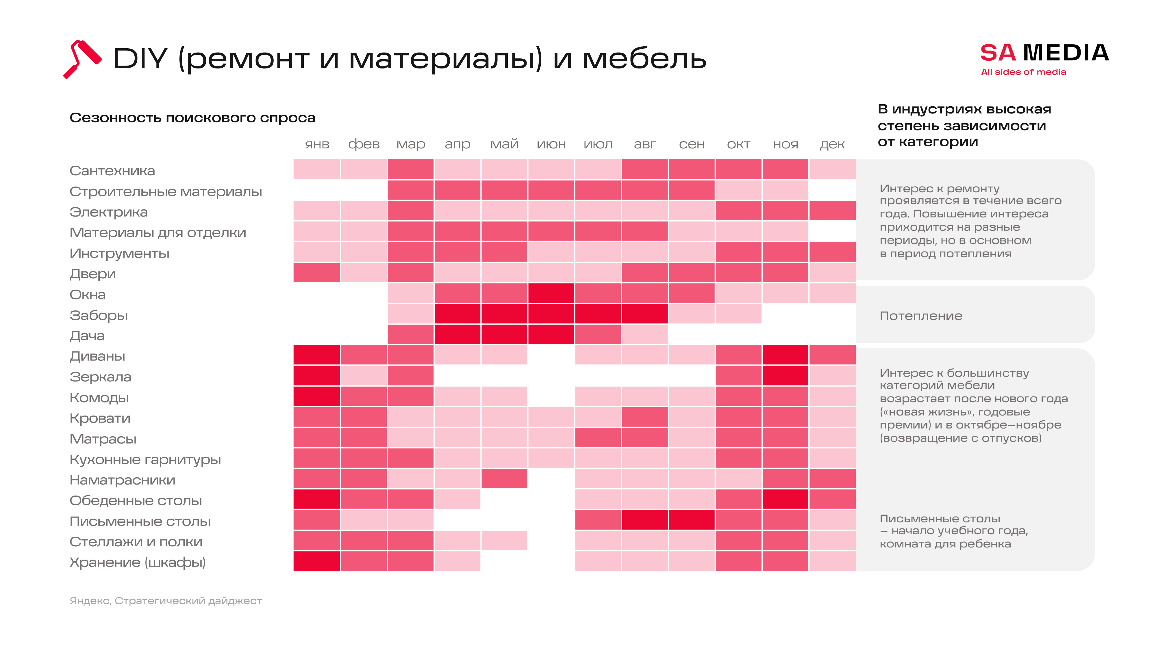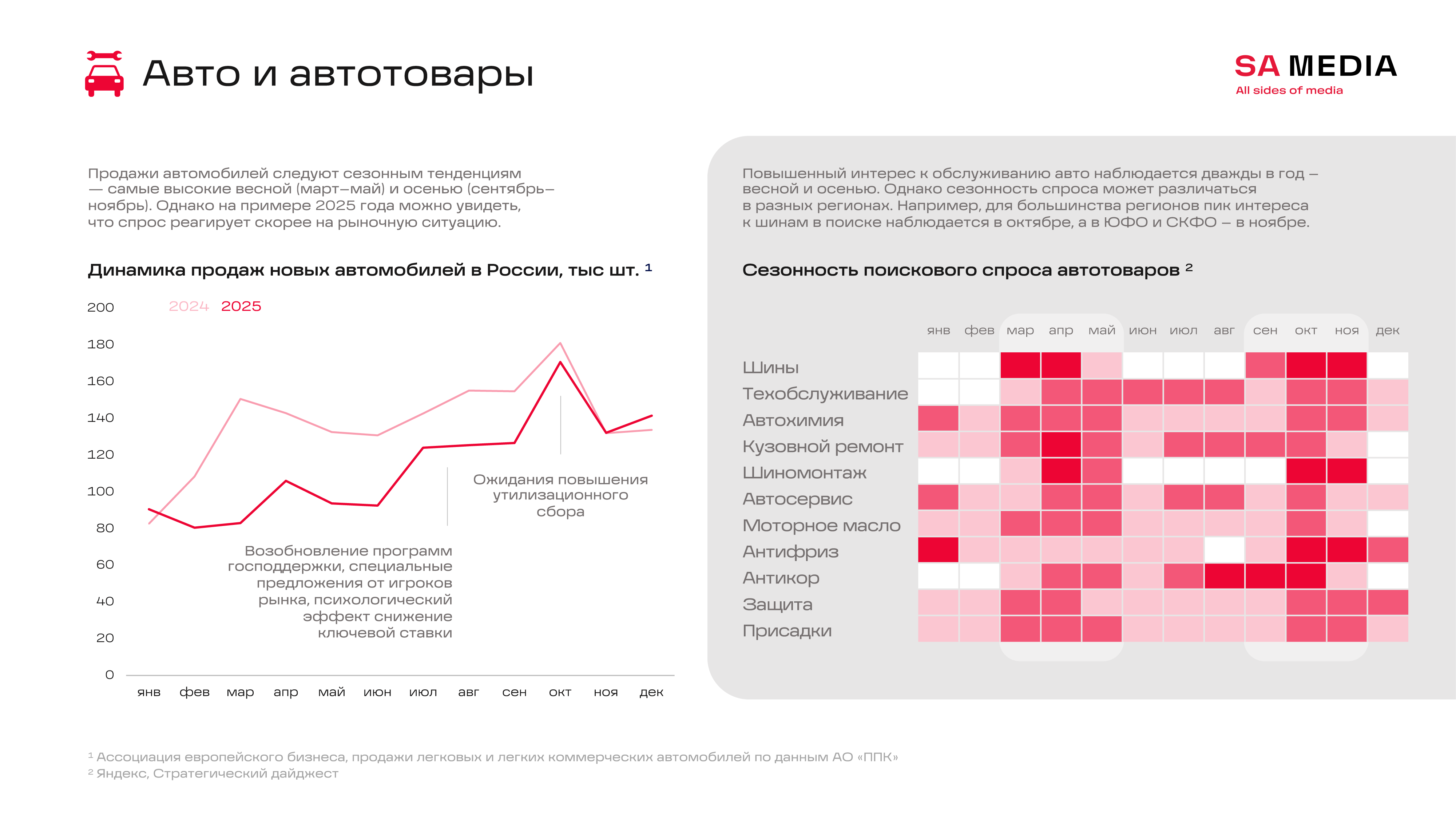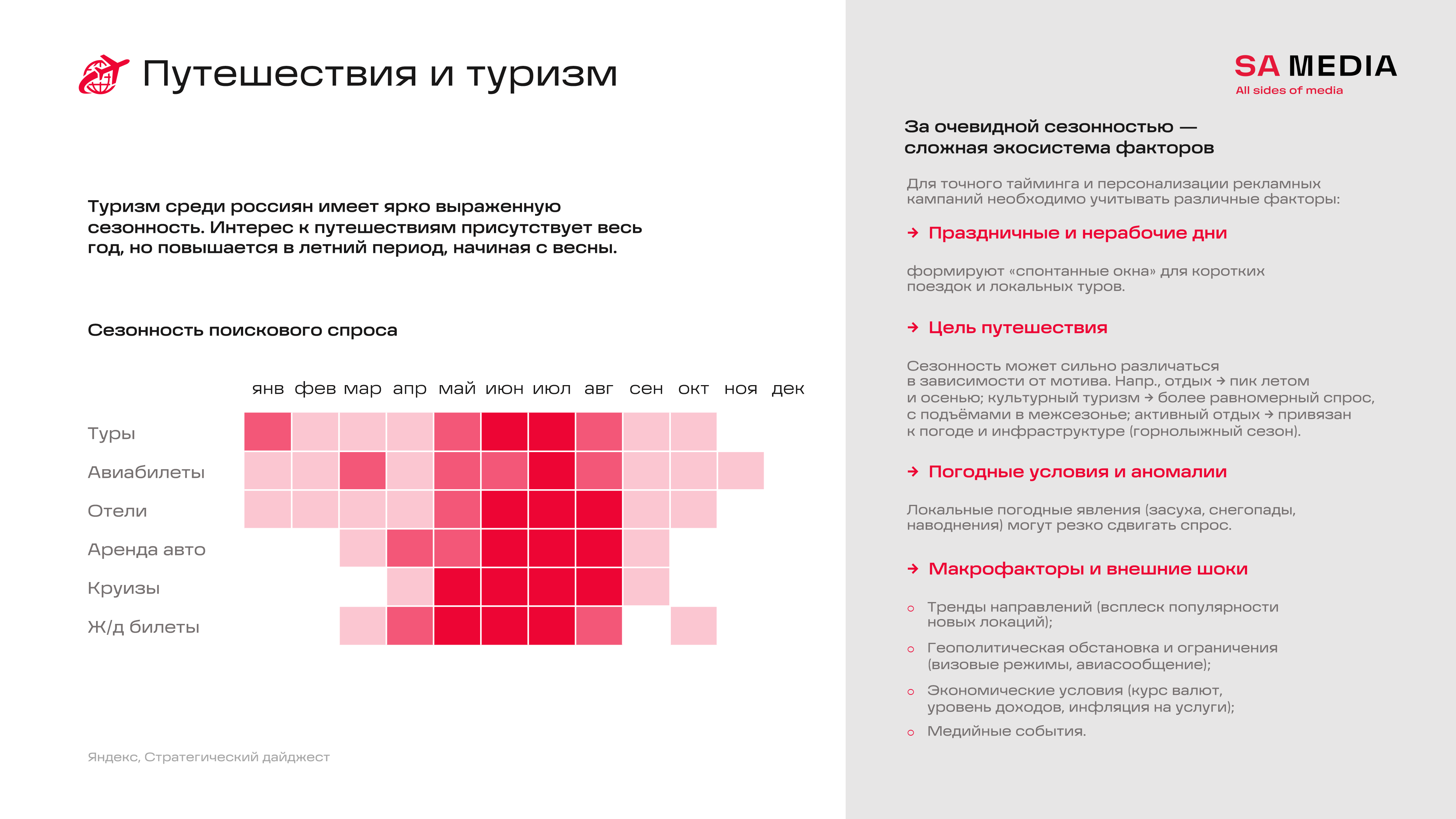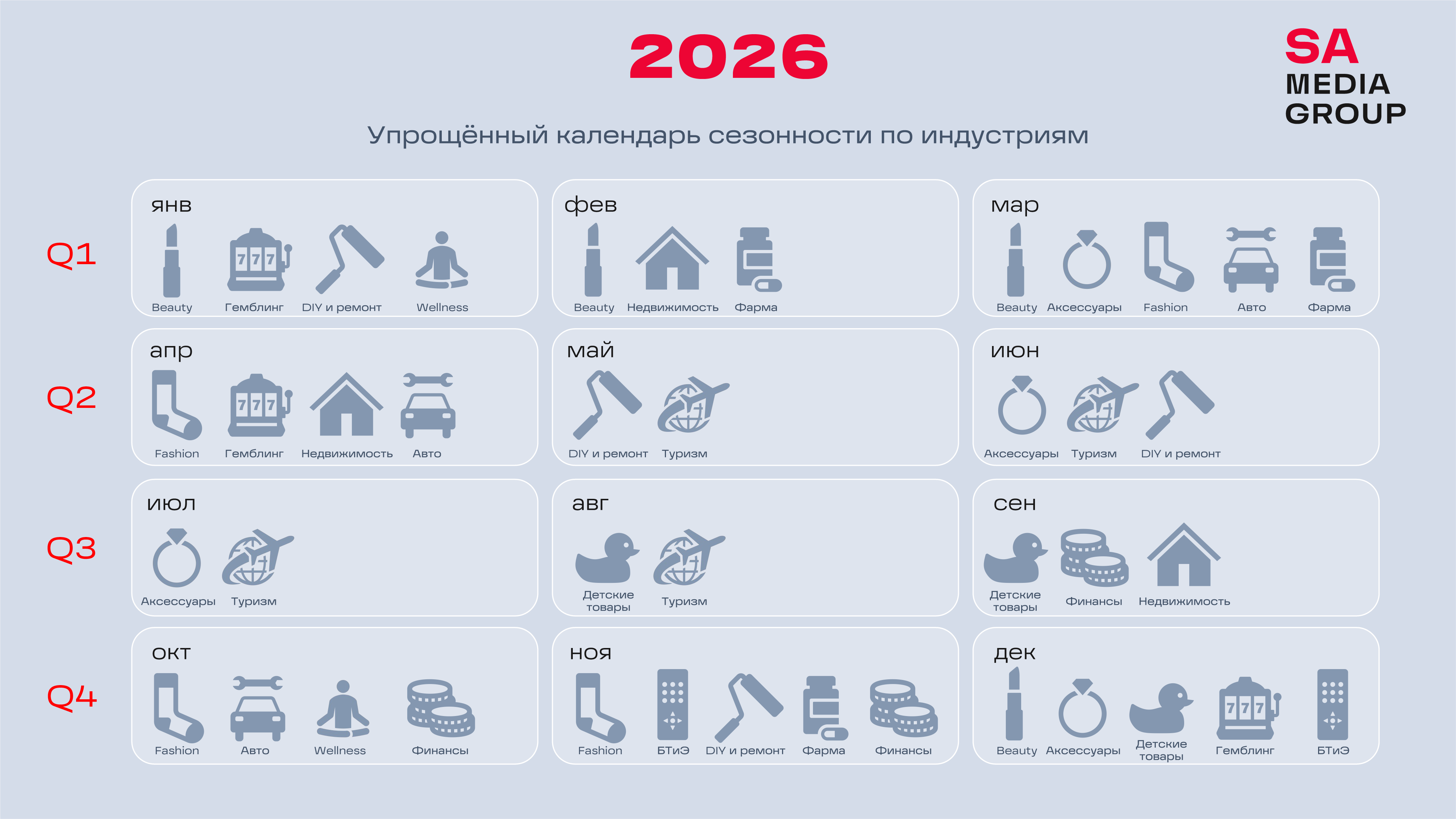 SA Media Group представила масштабное исследование сезонных колебаний спроса в 12 отраслях рынка. Аналитики отследили поведение потребителей и выявили закономерности, которые помогут бизнесу эффективнее планировать рекламные бюджеты. Материал 18+