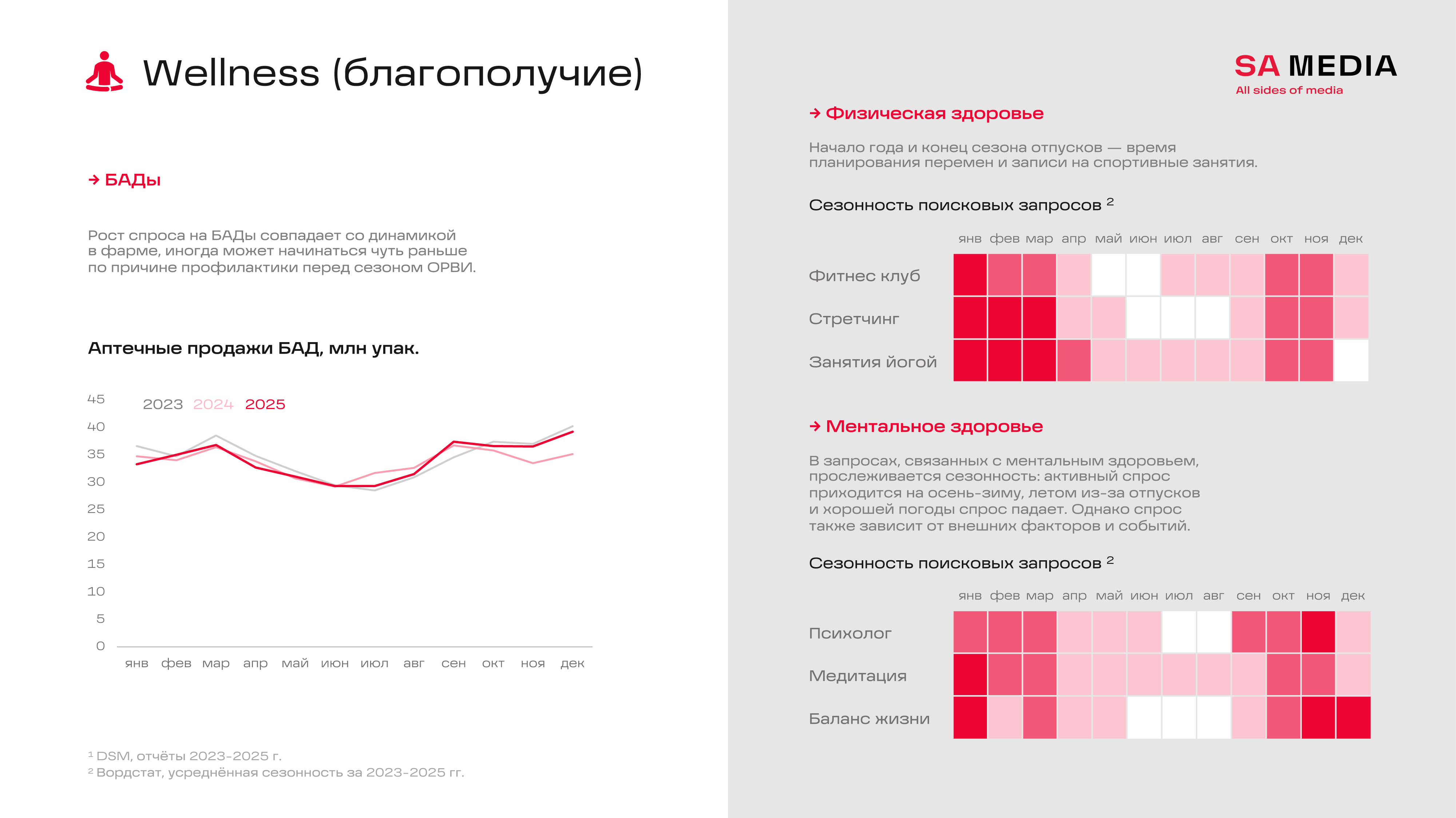 Wellness-сегмент объединяет БАДы, физическую активность и ментальное здоровье — три категории с принципиально разными сезонными циклами. Объединяющий фактор: все они чувствительны к жизненным событиям и внешнему стрессу.