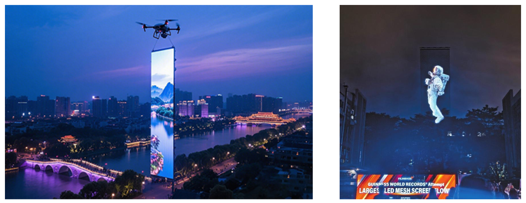 В Китае совершен прорыв на стыке технологий и рекламы: компания Shenzhen Filmbase создала самый большой в мире летающий LED-экран. Это гаджет, попавший в Книгу рекордов Гиннесса с площадью 72,66 м² и разрешением 300 000 пикселей.