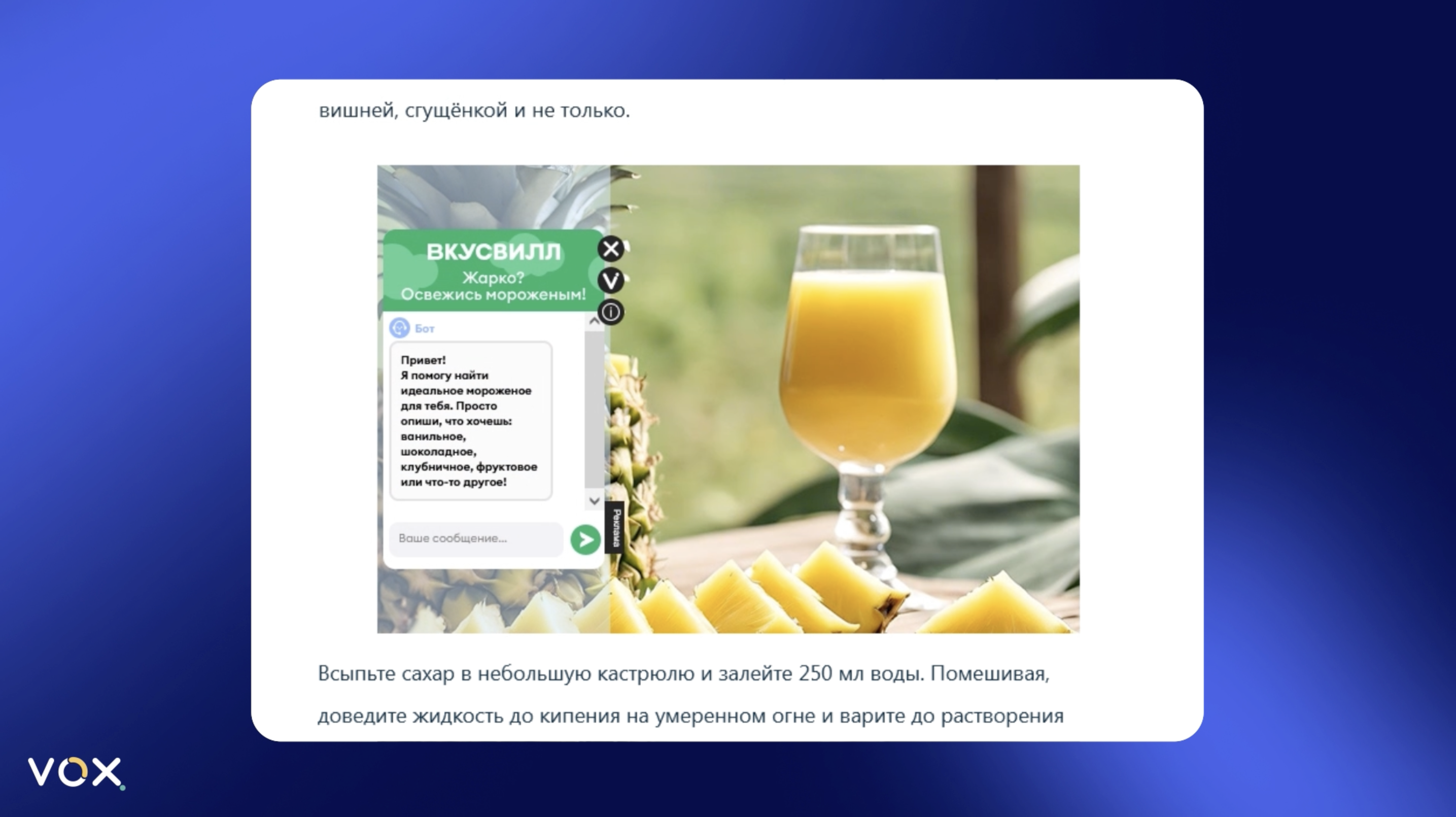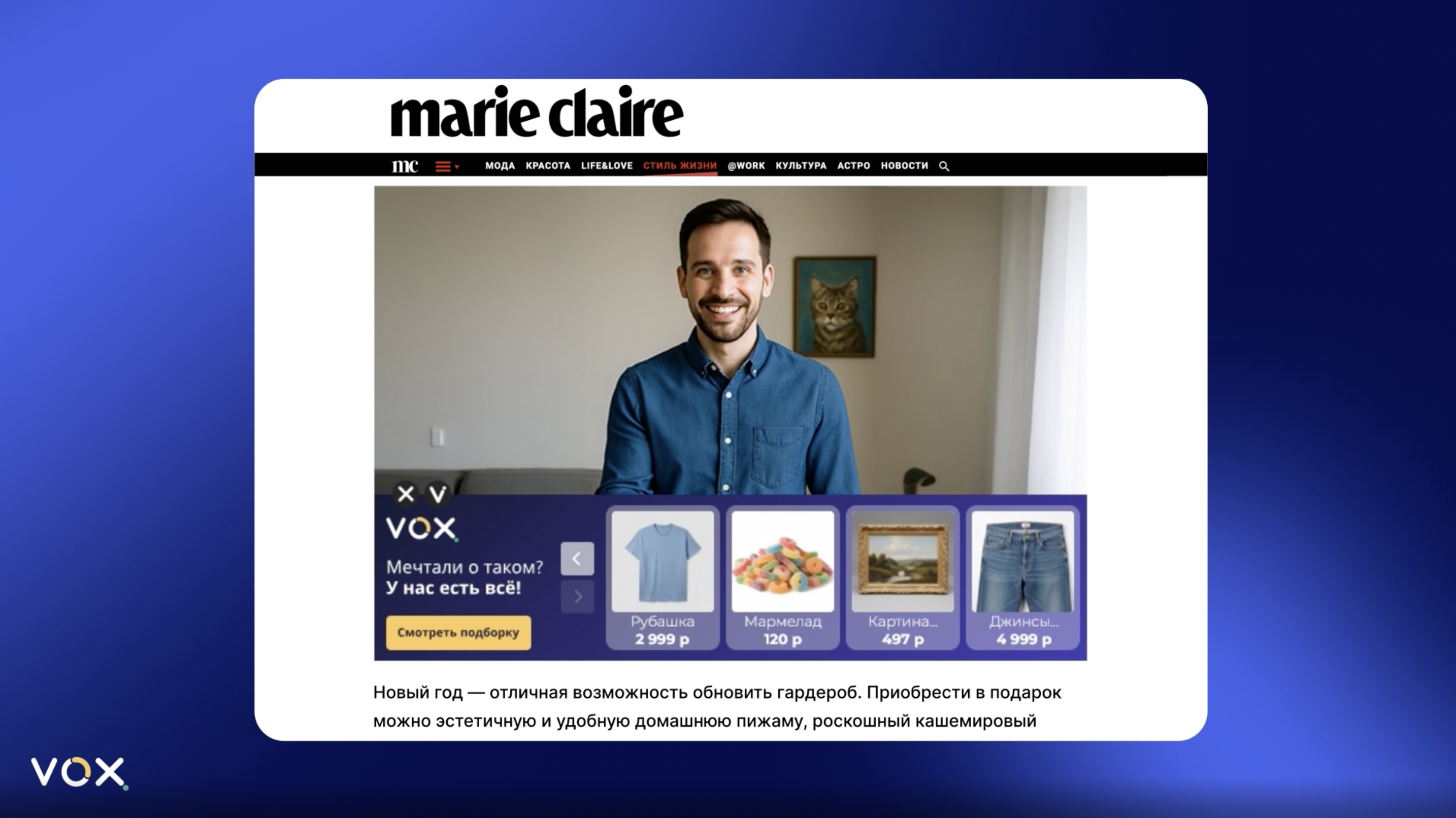 За несколько лет VOX перешел от нативной рекламы на базе computer vision (компьютерное зрение) к ИИ-форматам, которые дают WOW-эффект и персонализированную механику.