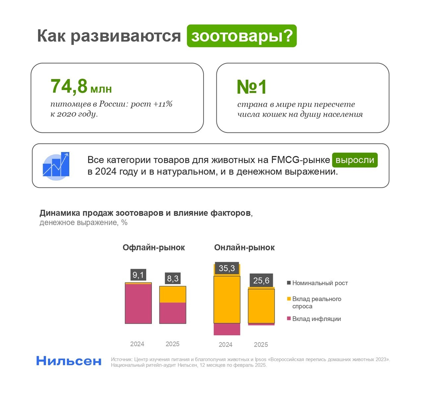 В России динамика тоже положительная: с февраля 2024 по февраль 2025 года объем этого рынка превысил 355 млрд руб. Самыми высокими темпами росли лакомства: их динамика увеличилась более чем на 20%.
