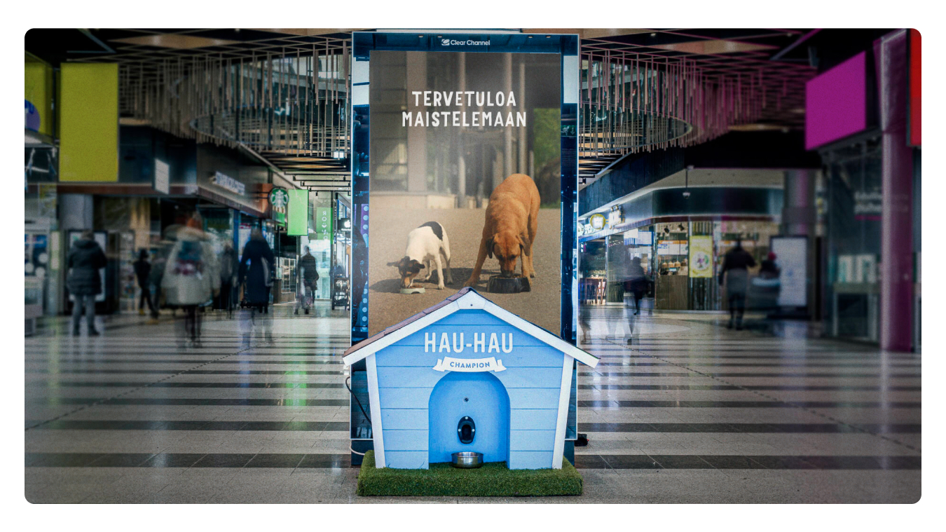 Наружная реклама финского бренда кормов для собак Hau-Hau Champion представляет собой собачью будку с миской, интегрированную в цифровой рекламный щит. Устройство распознает приближающуюся собаку и бросает ей в миску гранулы корма. Механизм работы основан на программном обеспечении для распознавания видео на базе искусственного интеллекта. Собака сначала слышит звук, потом чувствует запах и, наконец, пробует корм на вкус.