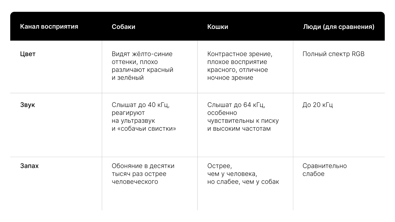 По мнению, зоопсихолога и тренера собак Аллы Ухановой, у собак и кошек высочайшая способность улавливать и обрабатывать запахи. Собаки вообще «видят» мир носом: множество исследований указывают, что они определяют по запаху время, место и другие детали. Слышат собаки тоже «громче» людей и в более широком диапазоне, поэтому многие животные сталкиваются с шумофобией, боязнью громких звуков, и даже безобидная игрушка-пищалка может напугать щенка, особенно в возрасте пяти-семи месяцев. Важно помнить про это и в случае с рекламой, ведь из-за разницы восприятия некоторые стимулы могут отталкивать животных.