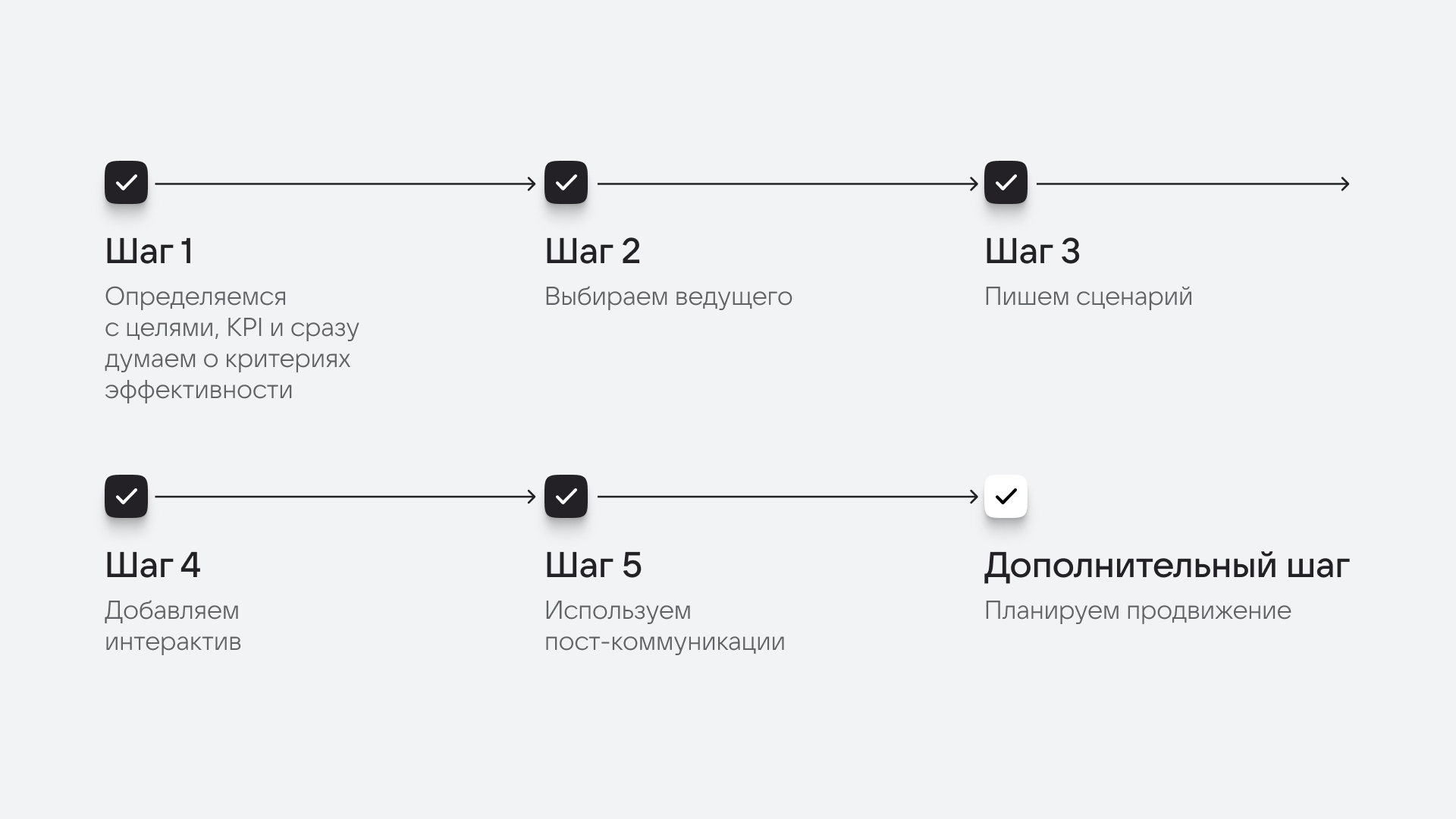 Именно поэтому в сценарии важно использовать принцип «колеса продаж»: нужно повторять все блоки во время эфира и удерживать внимание аудитории. Также стоит учитывать, что зрители подключаются к трансляции в разное время. Часть аудитории не видела начало эфира, поэтому ключевые тезисы и выгоды необходимо повторять каждые 5–7 минут.
