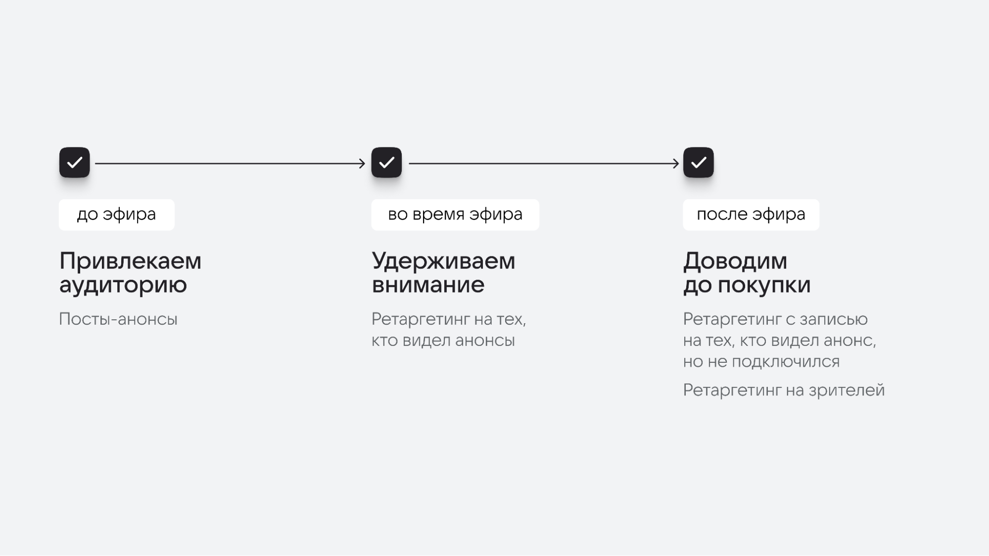 Во время эфира запустите кампанию на тех, кто уже видел анонс. После трансляции работайте с отложенным спросом. Здесь возможен ретаргетинг с записью эфира на тех, кто видел анонс, но не подключился, а также на зрителей, чтобы подтолкнуть «теплую» аудиторию к покупке.