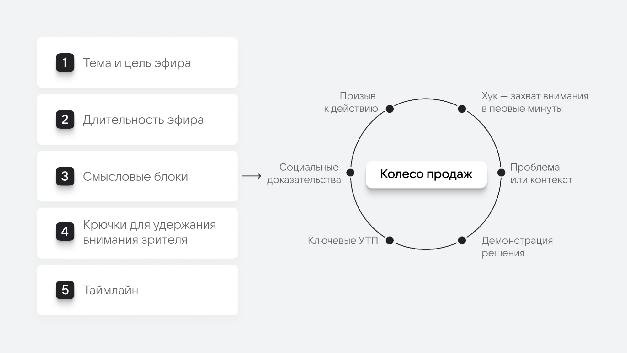 3. Смысловые блоки. В товарных стримах чаще всего используется базовая логика «колеса продаж» (про нее дальше), которая помогает удерживать внимание и последовательно вести зрителя к покупке.