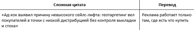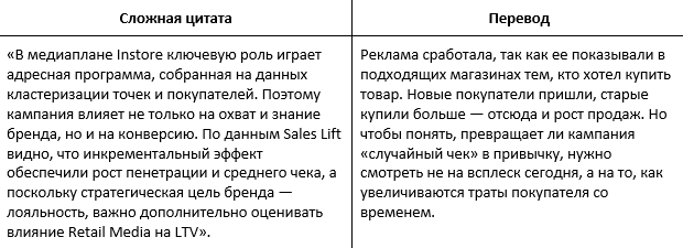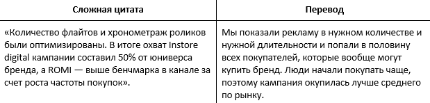 Второй — человеческий. Вы говорите: «Мы поняли, кто наши покупатели, показали рекламу тем, кому надо, и люди стали покупать чаще. Деньги не потеряли, а заработали». Согласитесь, так понятнее.