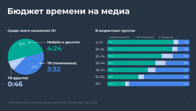 Эксперт подчеркнула возрастную динамику в потреблении контента. Молодежь в возрасте 12–17 лет проводит 81% экранного времени с мобильными устройствами и лишь 6% за просмотром ТВ. В группе 18–24 года это соотношение составляет 79 к 7%, а среди аудитории 25–34 года — 66 к 14%. Иная картина наблюдается у пожилых россиян. Они 74% времени проводят у телеэкрана и 22% — с мобильными устройствами.