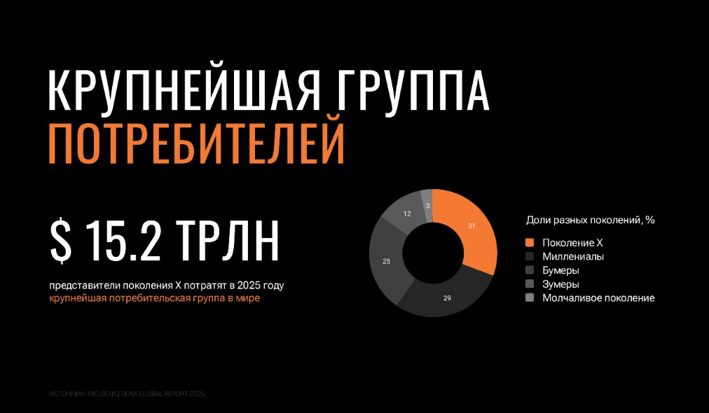 По данным Nielsen Global Report, которые привел эксперт, поколение X составляет 31% мирового населения, а объем их расходов в 2025 году составит $15,2 трлн.