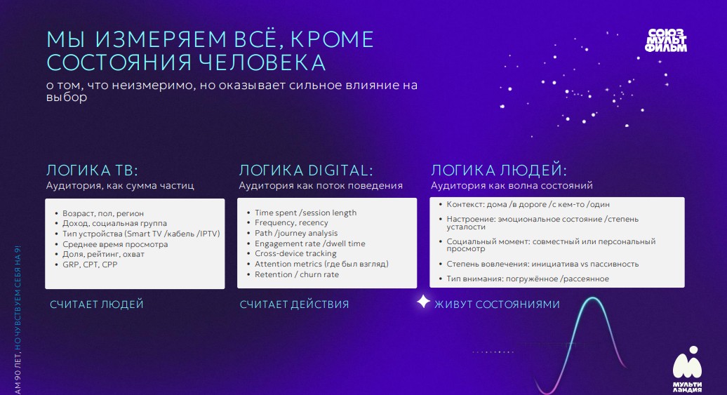 «Мы описываем аудиторию как ”сумму частиц” в логике ТВ или как “поток поведения” в диджитале, но игнорируем главное — люди живут состояниями», — заявила Дворядкина.