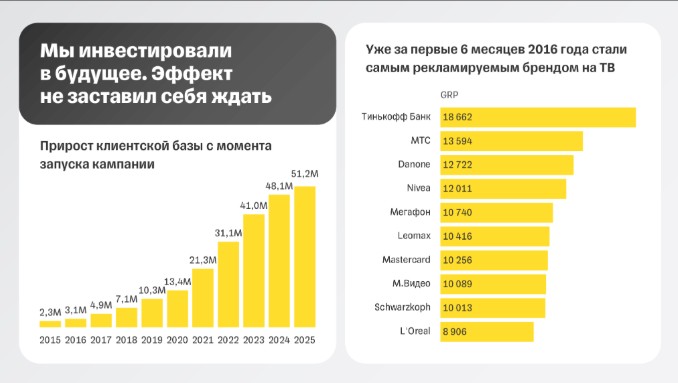 Михаил Горбунцов, медиадиректор Т-Банка, поделился опытом долгосрочных инвестиций кредитной организации в телевидение за последние 15 лет. Он рассказал, что до 2015 г. банк продвигался только в диджитал-среде, а переход на федеральные каналы стал решающим шагом для компании. Всего через полгода бренд вышел в лидеры по телерекламе с 18 тыс. GRP, обогнав таких крупных рекламодателей, как МТС и Danone.