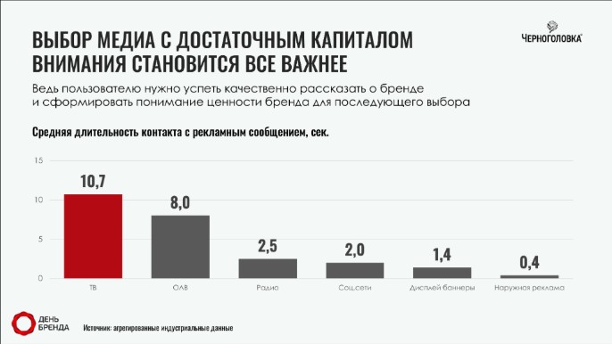 В этих условиях, как отметила спикер, важным становится выбор медиа с высоким «капиталом внимания». Телевидение здесь сохраняет преимущество — средняя длительность контакта с рекламным сообщением на ТВ составляет 10,7 секунды, что в несколько раз выше, чем в цифровых каналах.