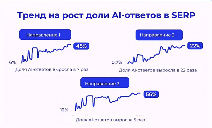 Федор Смирнов, Head of SEO «билайна», поделился результатами проведенного по трем направлениям замера доли AI-ответов в SERP (Search Engine Results Page), которая показала рост — в 5–22 раза в зависимости от сегмента.