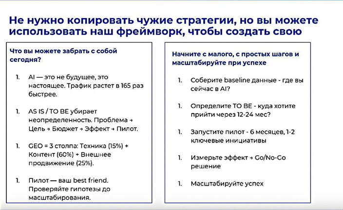 С бизнесом нужно говорить на его языке — язык SEO уже не продает идеи должным образом. GEO же помогает понять «боли» бизнеса и попасть в AI-ответы, защищая до 15% текущего SEO-трафика и обеспечивая новые каналы прироста. При этом нужно понимать, что обсуждение GEO в команде должно происходить не сверху вниз, а на равных.