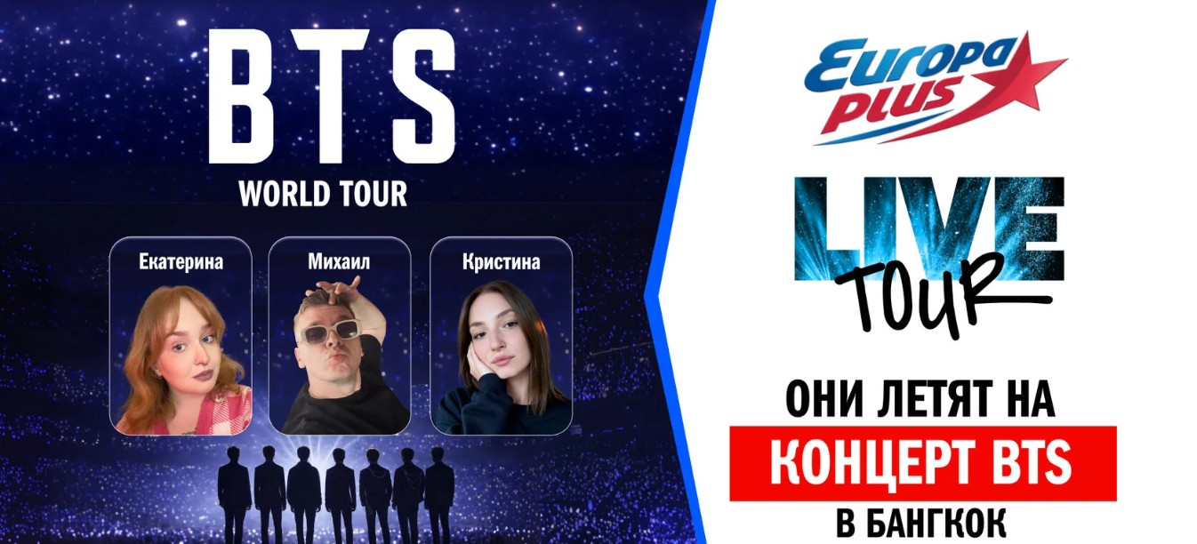 «Европа Плюс» разыграла поездку на концерт BTS в Бангкоке. Радиостанция отправит шестерых победителей вместе с сопровождающими. Организаторы берут на себя авиаперелет, проживание и билеты. Заявки принимались с 16 марта по 3 апреля, победителей определяли в прямом эфире утреннего шоу «Бригада У».
