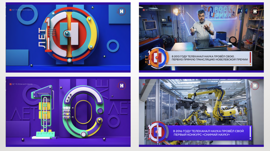 Важной задачей стала разработка визуализации, привлекающей внимание к каналу и юбилею. Она должна была быть универсальной для различных сред и форматов использования: от элементов в телевизионном эфире до наружной рекламы и сувенирной продукции. Поэтому команда разработала дизайн. Его ключевым элементом стала круглая дата — 10 лет, а главным принципом юбилейного оформления — простота, наглядность, яркость. Общий стиль, узнаваемость и разнообразие визуальных форм позволили использовать новое оформление в решении поставленных задач.