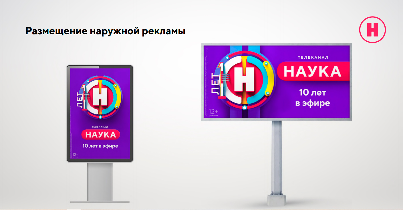 Юбилей и новое оформление канала поддержали промокампанией: на территории Москвы разместили наружную рекламу на 34 поверхностях, создали и выпустили в эфир телеканалов группы АО «Цифровое Телевидение» ролики канала «Наука» в новом дизайне.