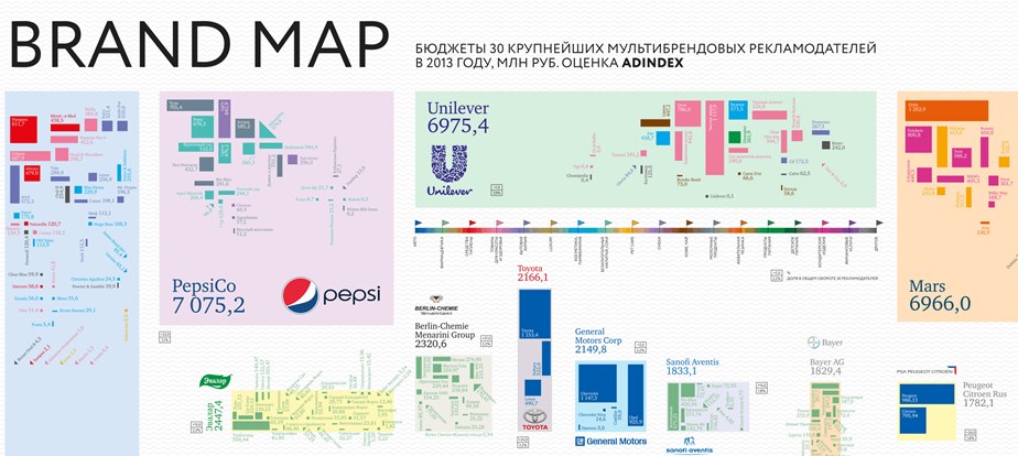 На карте приведены бюджеты 30 крупнейших мультибрендовых рекламодателей в 2013 году, млн руб