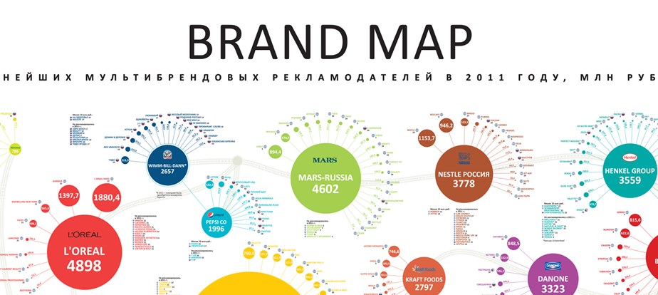 На карте приведены бюджеты 30 крупнейших мультибрендовых рекламодателей в 2011 году, млн руб.