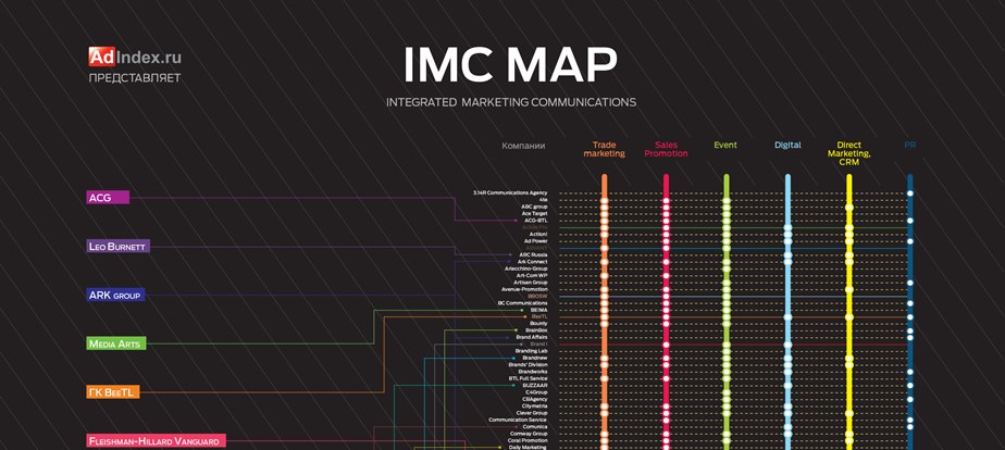 На карте указаны крупнейшие сетевые коммуникационные группы, а также независимые агентства, работающие в разных рекламных сегментах, как, то: медиа, digital, креатив, PR, маркетинговые коммуникации и пр.