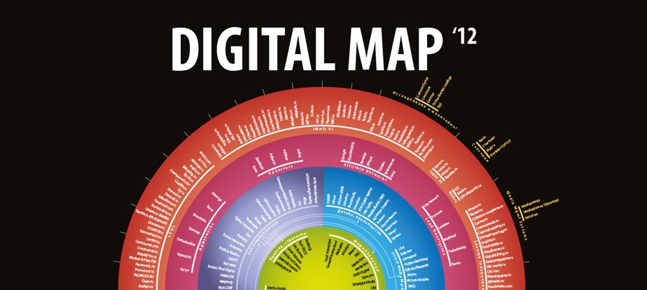 На карте представлена структура digital-рынка в 12 сегментах: закупки медийной (баннерной и видео) рекламы, контекстная реклама, SEO, креатив / стратегии, Web Production & Support, Mobile Production, Digital PR / SMM, лидогенерация, Programmatic Buying, Direct Marketing / CRM и мобильный маркетинг.