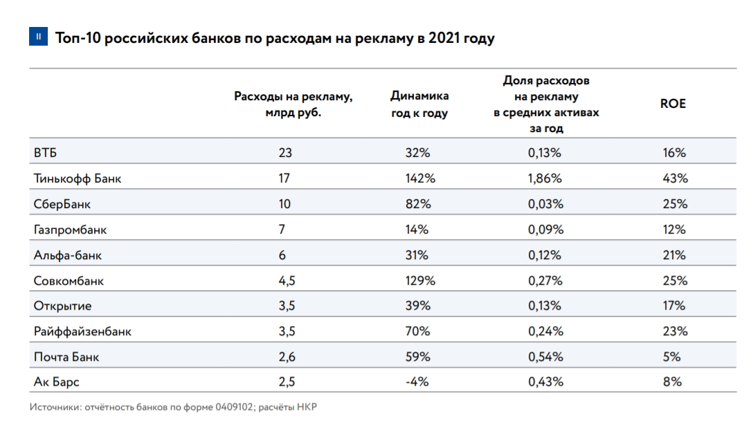 - Абсолютным лидером по затратам на рекламу остается ВТБ, маркетинговый бюджет которого оценен в 23 млрд руб.